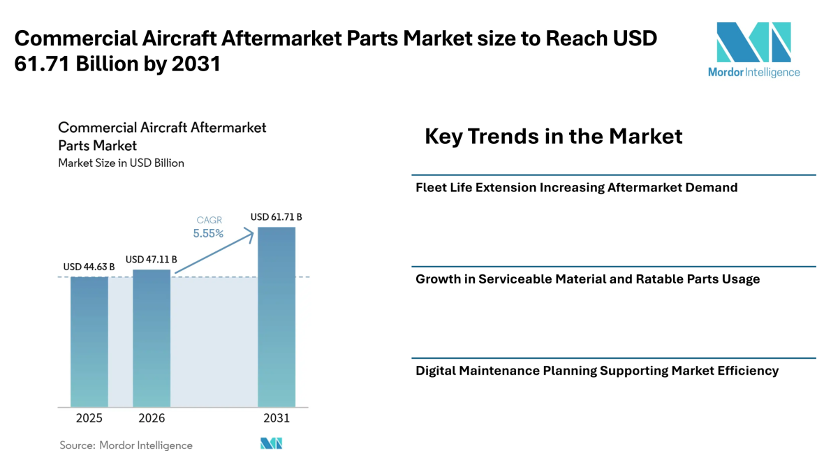 According to Mordor Intelligence, the commercial aircraft aftermarket parts market size is expected to increase from USD 44.63 billion in 2025 to USD 47.11 billion in 2026, with the commercial aircraft aftermarket parts market forecast indicating it will reach USD 61.71 billion by 2031. This steady rise reflects a consistent need for replacement parts, maintenance services, and lifecycle support across global airline fleets.