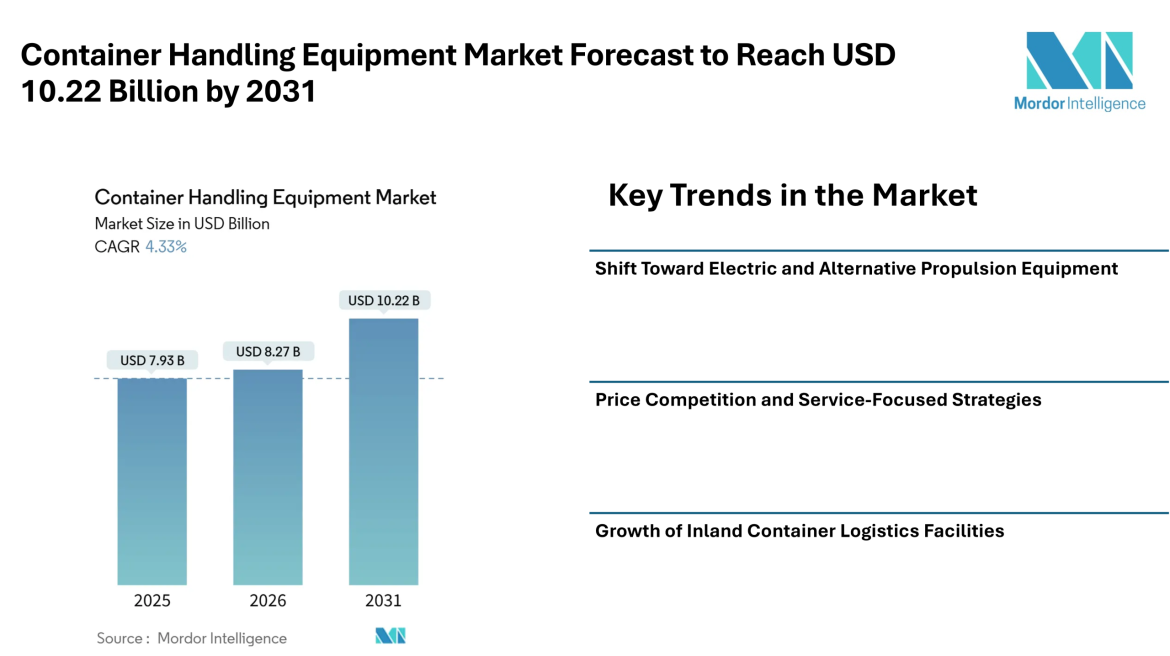 According to Mordor Intelligence, the container handling equipment market size is expected to grow from USD 7.93 billion in 2025 to USD 8.27 billion in 2026, with the container handling equipment market forecast indicating it may reach USD 10.22 billion by 2031. This progress reflects consistent investments in cargo handling infrastructure and modern equipment used in terminals, depots, and freight facilities worldwide.