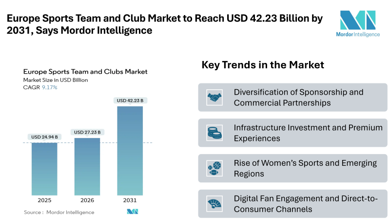 Home Press ReleasesEurope Sports Team and Club Market to Reach USD 42.23 Billion by 2031, Says Mordor Intelligence