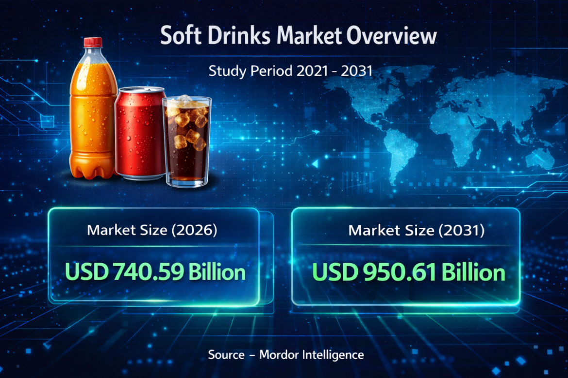 The global soft drinks market size is projected to grow from USD 740.59 billion in 2026 to USD 950.61 billion by 2031, reflecting a CAGR of 5.12% during the forecast period. Market growth is increasingly shaped by health-conscious consumption patterns, regulatory sugar controls, and demand for functional and clean-label beverage options.