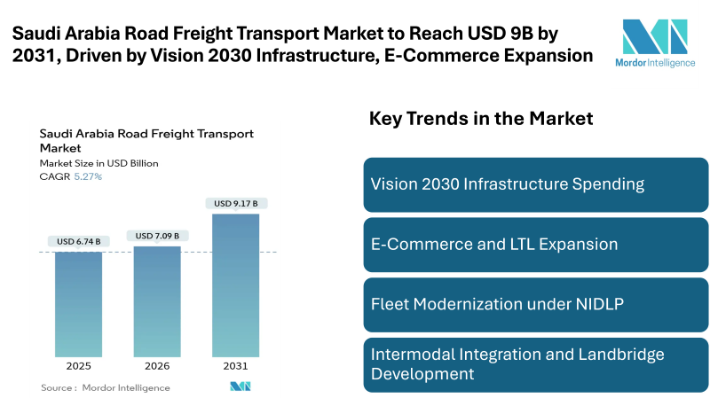 According to Mordor Intelligence, the Saudi Arabia road freight transport market is expected to grow from USD 6.74 billion in 2025 to USD 7.09 billion in 2026 and is forecast to reach USD 9.17 billion by 2031, registering a CAGR of 5.27% during the forecast period. The market growth is supported by national infrastructure investments, logistics reforms, and rising domestic consumption.