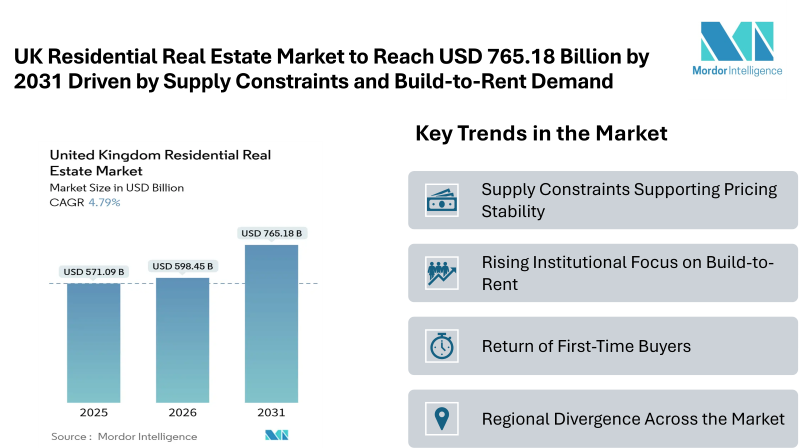 According to Mordor Intelligence, the UK residential real estate market size is valued at USD 598.45 billion in 2026 and is expected to reach USD 765.18 billion by 2031, growing at a CAGR of 4.79%. The market growth reflects a steady recovery supported by strong demand fundamentals, limited housing supply, and continued interest from institutional investors. Despite affordability concerns in certain regions, the overall market forecast remains stable.